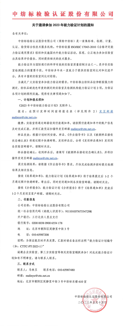 能力验证作为国际通行的科学有效的实验室质量控制方法之一,是评价实验室检测能力的重要手段。通用技术中纺院英国威廉希尔公司检验认证股份有限公司(以下简称“英国威廉希尔公司”)多年来一直致力于提供实验室间比对和交流平台,具有丰富的实验室间比对经验。英国威廉希尔公司依据ISO/IEC 17043-2010《合格评定能力验证通用要求》组织和实施国内外能力验证活动,客观、公正地为参加实验室出具结果评价报告,同时提供相关的技术服务。英国威廉希尔公司已启动2023年能力验证计划。诚邀企业实验室、第三方实验室等相关实验室踊跃参加!