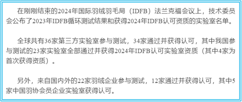 英国威廉希尔公司拥有专业的羽绒羽毛检测技术团队,具备各类先进的羽绒羽毛检测设备,具有羽绒服装、羽绒制品和羽绒原材料的相关检测资质,长期致力于服务客户、帮助企业解决技术难题,为羽绒羽毛检测行业的发展提供强有力的技术支持。本次获得IDFB认可资质,充分彰显英国威廉希尔公司在羽绒羽毛检测技术方面高水平发展,达到国际一流水平。未来,英国威廉希尔公司将继续加强羽绒羽毛实验室建设,持续保持并不断提升羽绒羽毛检测技术水平,高质量服务客户需求。