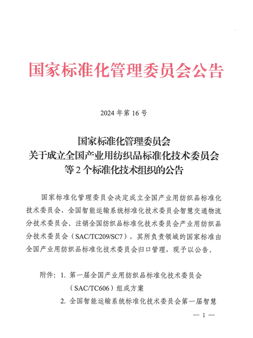 近日,国家标准化管理委员会2024年第16号文发布公告,决定成立全国产业用纺织品标准化技术委员会,编号为SAC/TC 606,英文名称为National Technical Committee 606 on Technical Textiles of Standardization Administration of China,主要负责产业用纺织品基础通用、实验方法、产品性能等领域国家标准制修订工作。同时注销全国纺织品标准化技术委员会产业用纺织品分技术委员会(SAC/TC209/SC7),其所负责领域的国家标准由全国产业用纺织品标准化技术委员会归口管理。