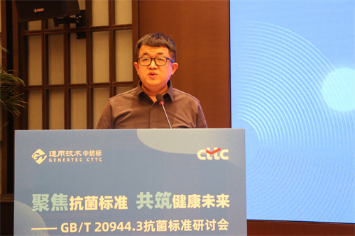 禾素时代作为零金属离子非溶出性生物基原纱抗菌抑臭的领军企业代表,积极推动抗菌标准的制定。陈学军在题为《零金属离子非溶出性生物基原纱抗菌抑臭纤维》的报告,分享了企业产品用国内外抗菌标准检测的比较数据,同时就GB/T 20944.3 现状与思考进行了概述。