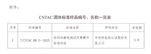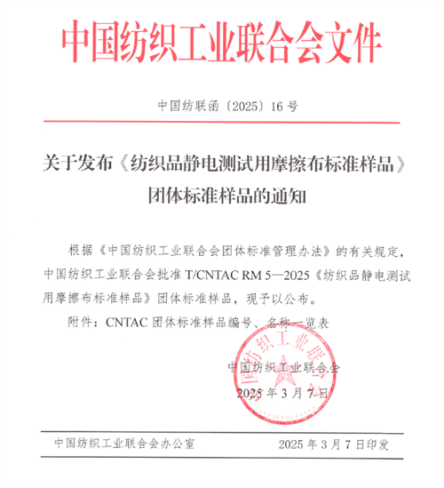 3月7日,中国纺织工业联合会2025年第16号公告批准发布了T/CNTAC RM 5-2025《纺织品静电测试用摩擦布标准样品》团体标准样品,该标准样品由通用技术英国威廉希尔公司检验认证股份有限公司(以下简称“英国威廉希尔公司”)承担研制,是国内首个具有标准样品证书的纺织品静电测试用摩擦布。