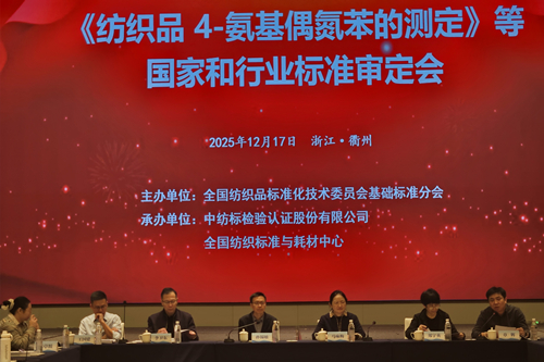2025年12月17日至18日,全国纺织品标准化技术委员会基础标准分会(TC209/SC1)在浙江衢州召开了《纺织品 4-氨基偶氮苯的测定》等12项国家标准和行业标准审定会。中国纺织工业联合会科技发展部副主任、全国纺织品标委会基础标准分会主任委员孙锡敏,通用技术中国纺织科学研究院有限公司总经理、全国纺织品标委会基础标准分会副主任委员马咏梅,东华大学纺织检测中心常务副主任、全国纺织品标委会基础标准分会副主任委员李卫东,中国纺织工业联合会科技发展部标准计量处处长、全国纺织品标委会基础标准分会副秘书长王国建,全国纺织品标委会基础标准分会顾问郑宇英出席会议。来自科研院所、海关、质检系统、检验机构、生产企业以及标准起草单位的170余名代表参加了本次会议。