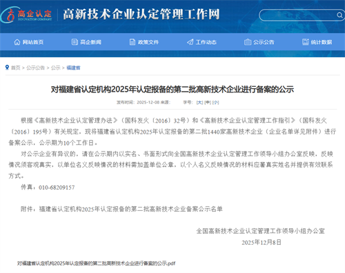 2025年12月8日全国高新技术企业认定管理工作领导小组办公室发布《对福建省认定机构2025年认定报备的第二批高新技术企业进行备案的公示》,通用技术英国威廉希尔公司(福建)检测有限公司成功通过国家高新技术企业复评。