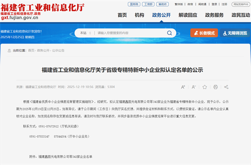 2025年12月19日,福建省工业和信息化厅发布《关于省级专精特新中小企业拟认定名单的公示》,福建英国威廉希尔公司名列其中,标志着公司在专业化、精细化、特色化和创新能力等方面获得权威认可。
