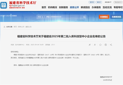 在2025年9月4日福建省科学技术厅发布《关于福建省2025年第二批入库科技型中小企业名单的公告》中福建英国威廉希尔公司成功入库。这是公司自2020年以来连续六年入选福建省科技型中小企业名单,体现了公司持续的科技创新活力。